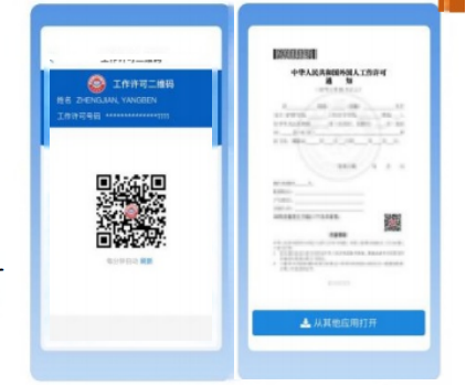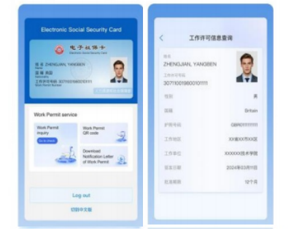 二、外国专家于电子社保卡(Electronic Social Security Card App)做工作许可查询(Work Permit Inquiry),为《外国人来华工作许可》(Work Permit)、《湖北省外国专家局准予行政许可决定书》高清截图并彩色打印(A4纸打印)1份。