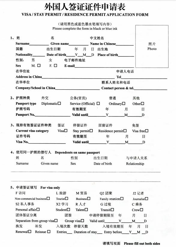 《外国人签证证件申请表》(VISA/STAY PERMIT/RESIDENCE PERMIT APPLICATION FORM)须A4纸正反打印,申请人本人手写签名、粘贴小2寸白底登记照,并加盖单位公章(与申请公函用章相同)。